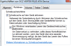 Öffnen den Gerätemanager devmgmt.msc und gehe zu Laufwerke. Doppelklicke auf die SSD-Platte und wechsle zum Register Richtlinien